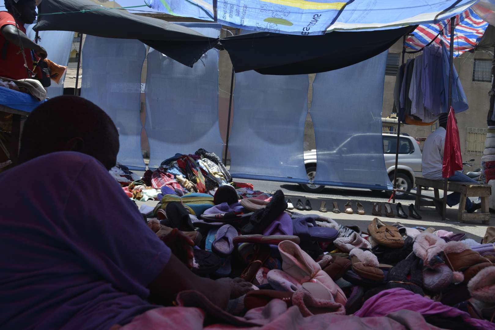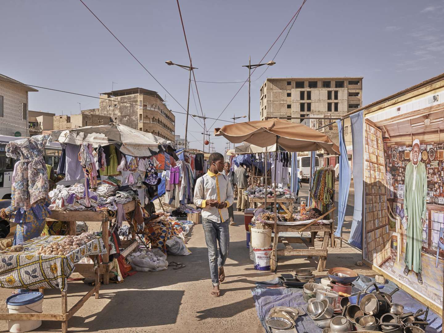 On veut revenir à la ville africaine : le commerce, la musique, la nourriture, les services, la publicité, les objets de consommation et la répétition : la ville africaine c’est la répétition des outils, des biens de consommations, de matériaux de construction déballés, improvisés sur la route.